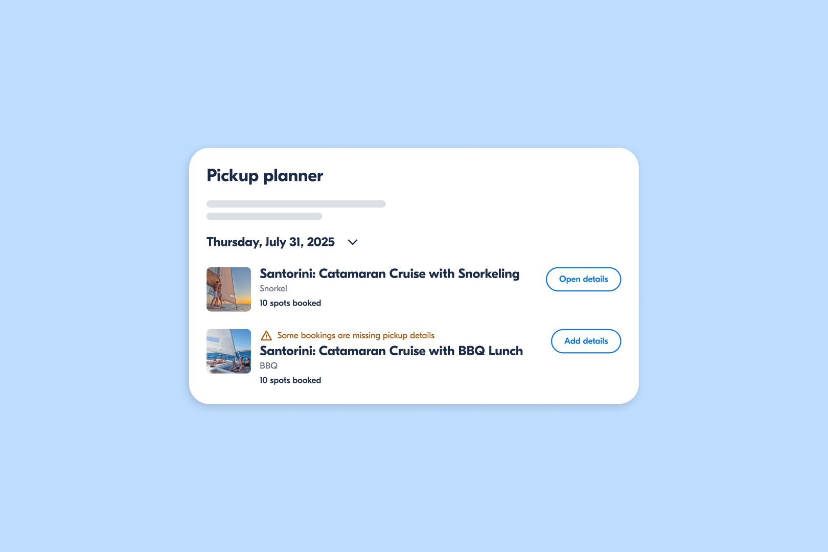 The Pickup Planner allows you to get a quick overview of all bookings that still need pickup details in one place. It creates a to-do list that shows exactly which bookings need your attention. You can sort them by time, tour, or level of urgency. This helps you stay on track of all these details so you’ll have more headspace to focus on your guests.